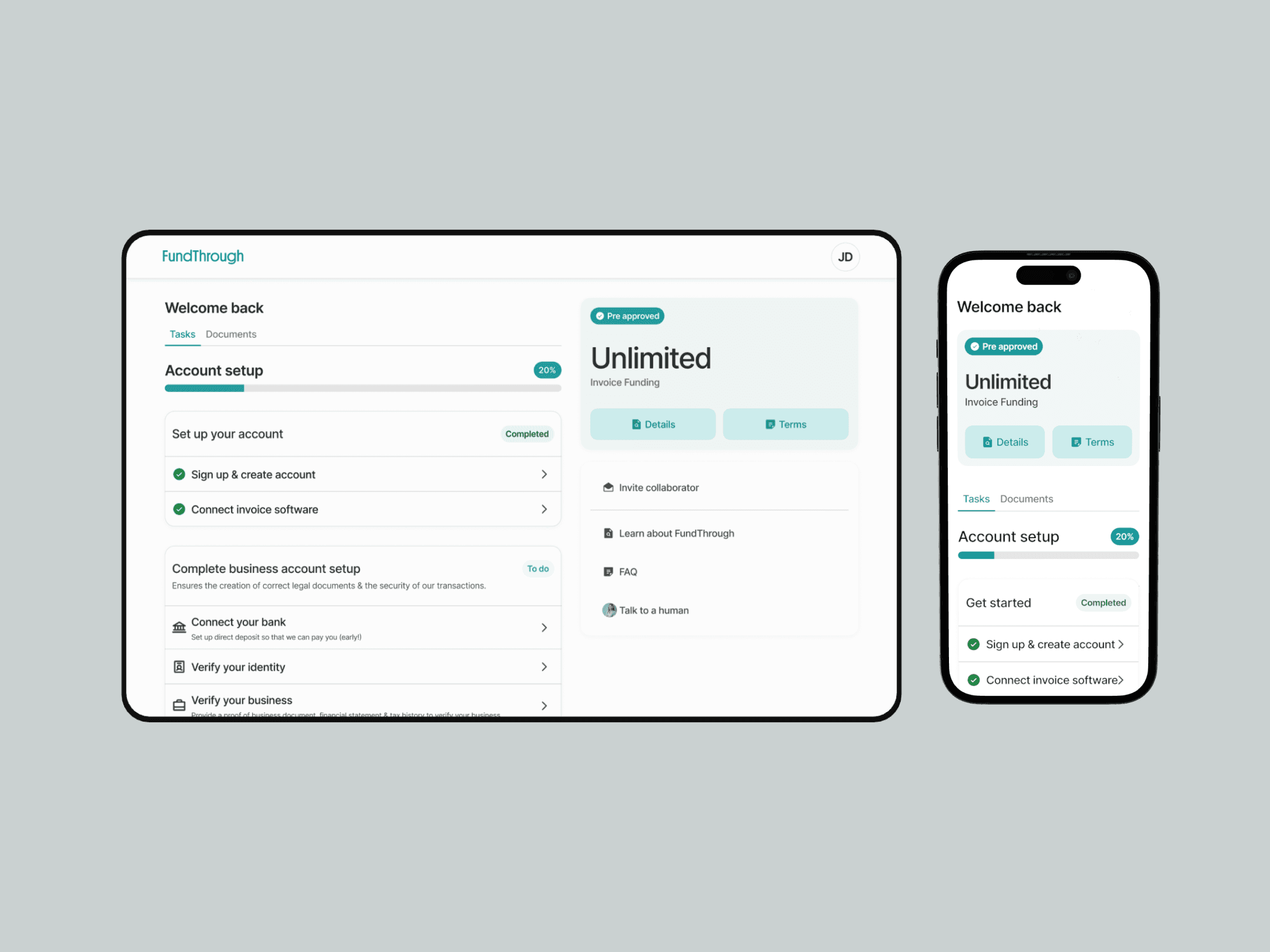 FundThrough is an invoice funding company innovating the practice of invoice factoring and invoice finance for the modern age. Combining client focussed research and visual design, my work here reimagines invoice factoring as modern, simple and human centered.
