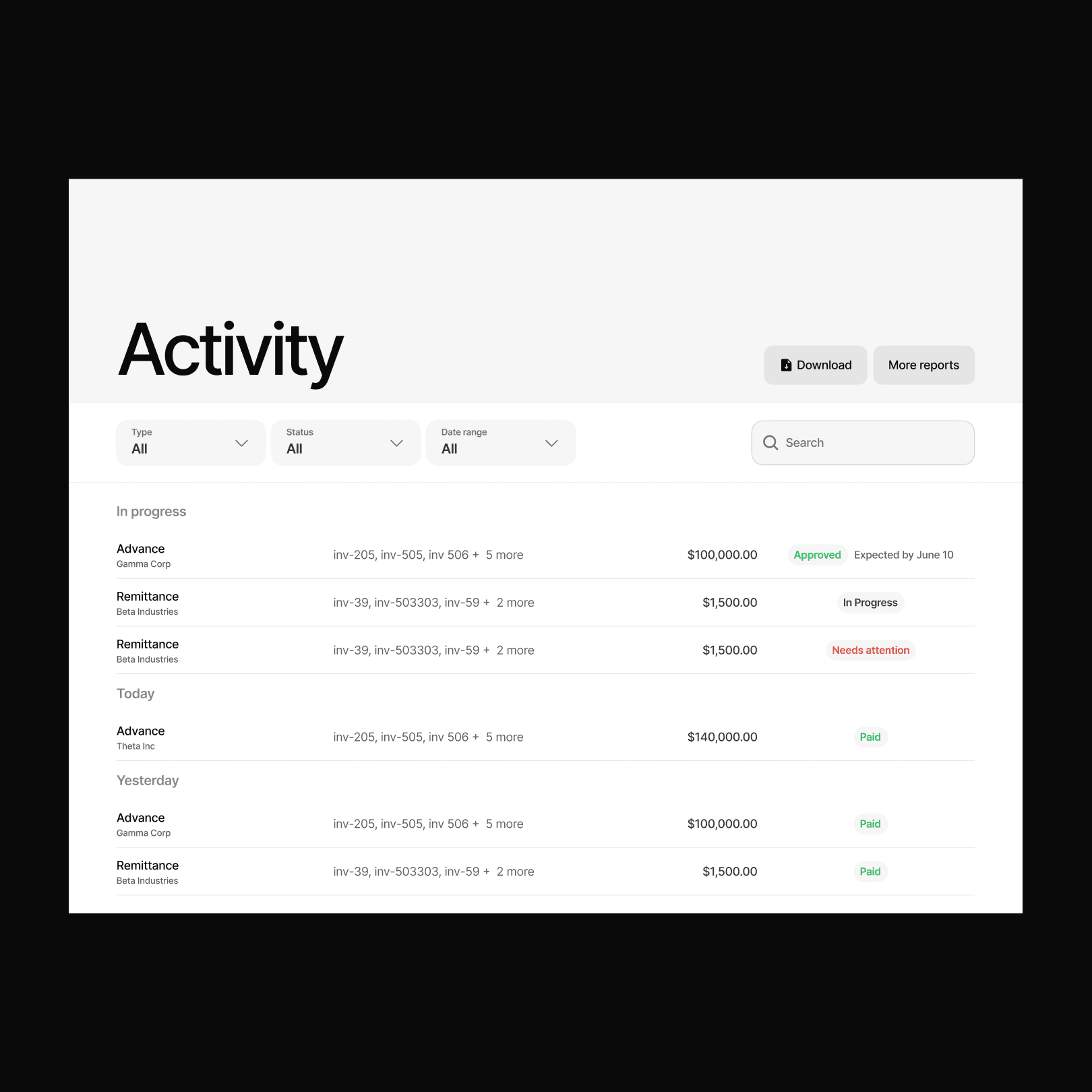 To solve for the number one question our teams would get, "when am I going to get paid". I designed an activity feed updates in real time. Filters & exports allow users to generate custom reports.